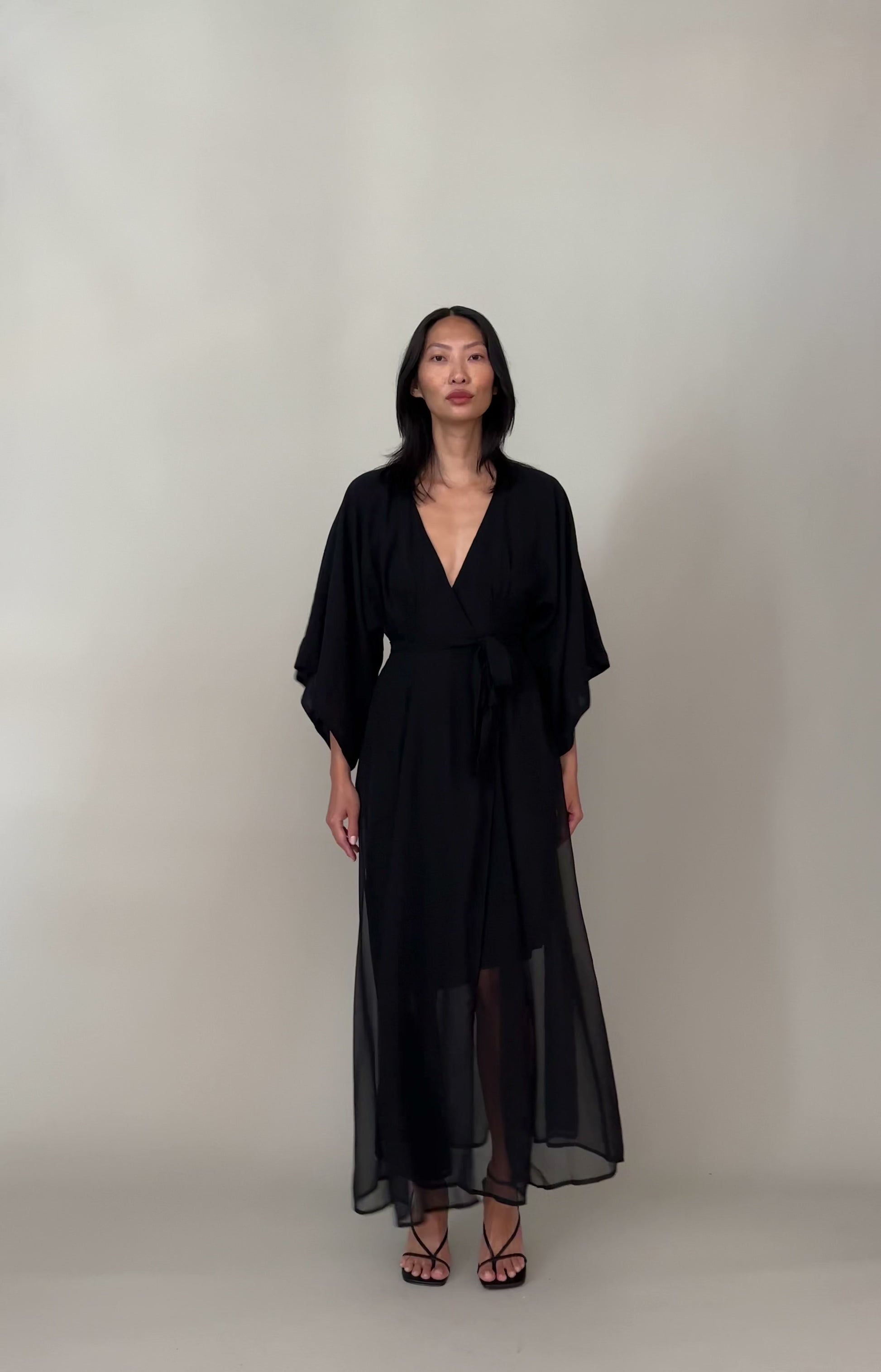 The statement piece you need for your next occasion. The Black Maxi is a wrap dress designed with a v-neckline, kimono sleeves, and a lightweight, flowy skirt. An effortless, luxe, and timeless look.