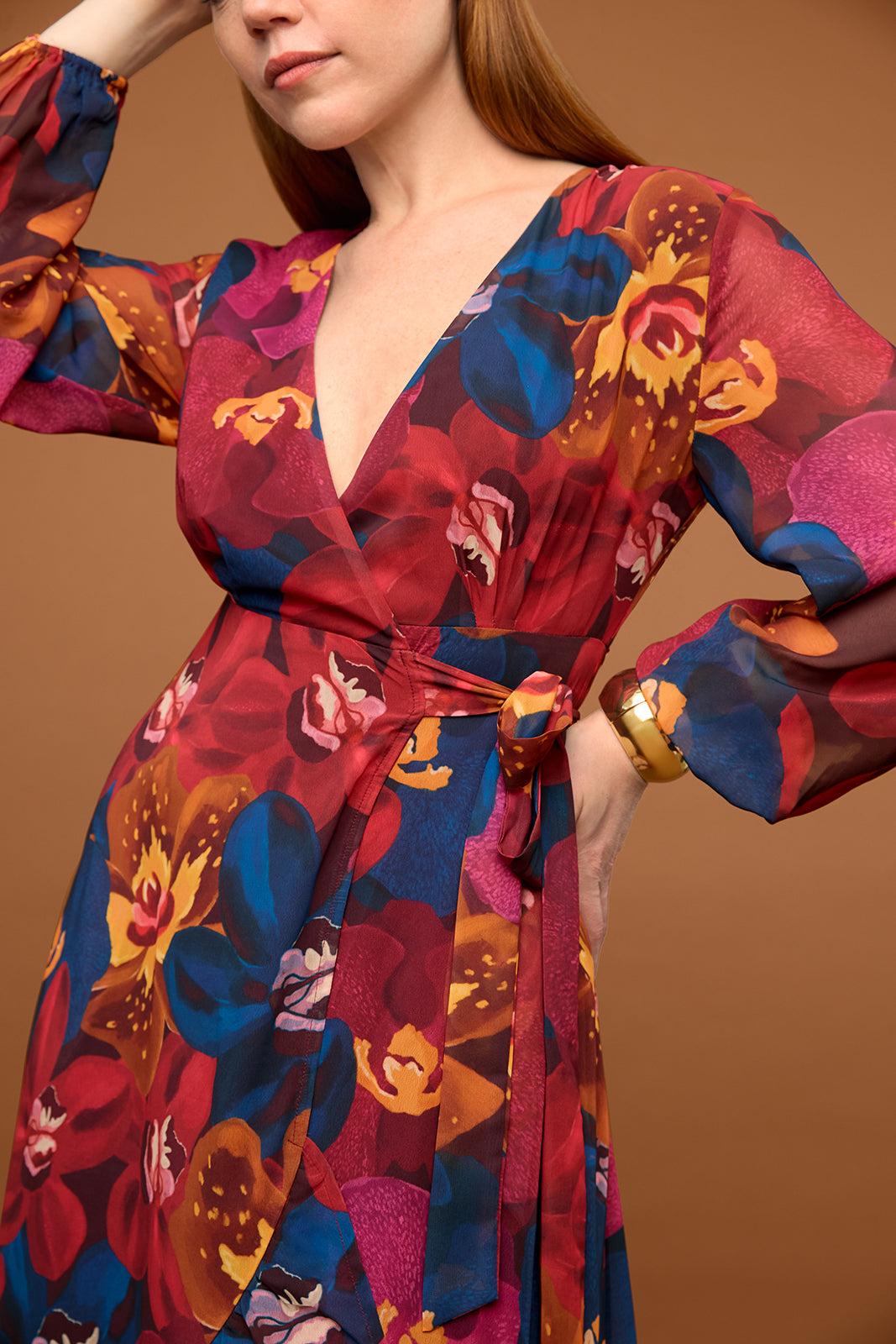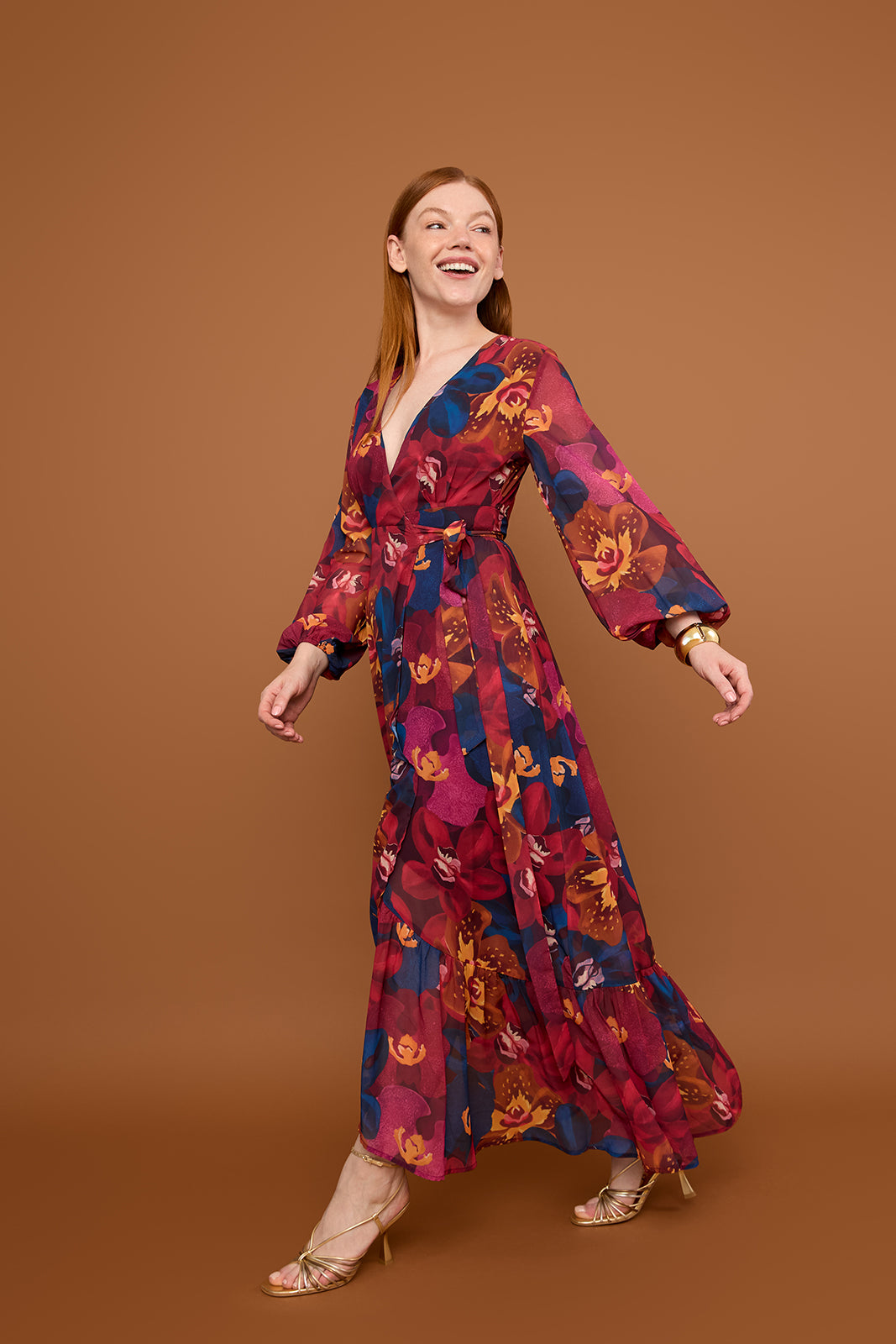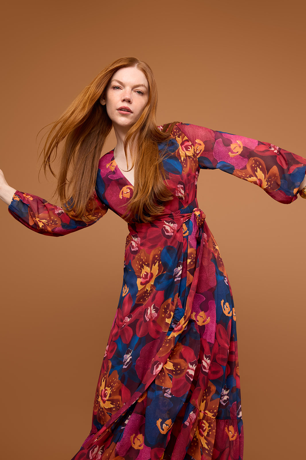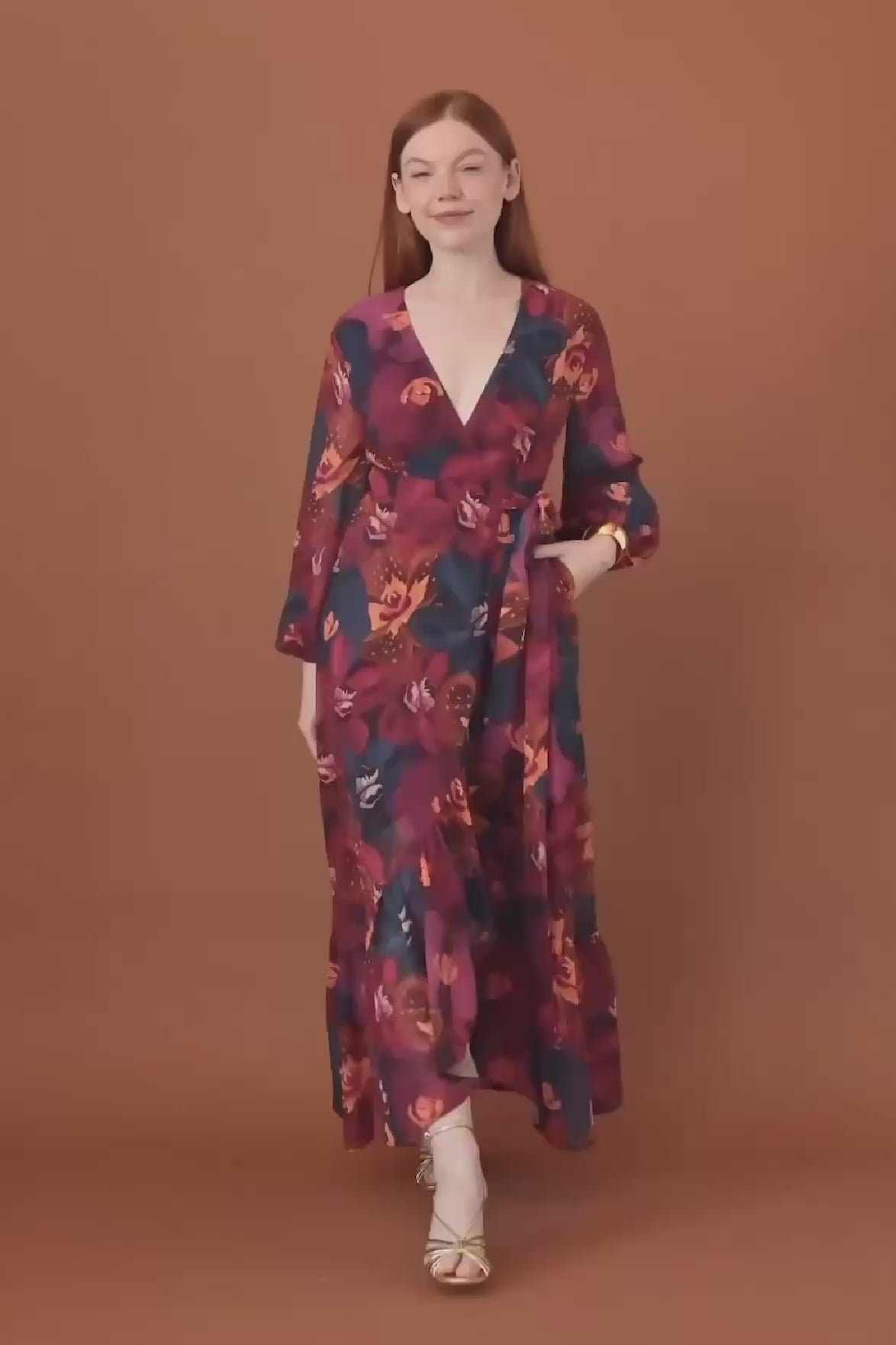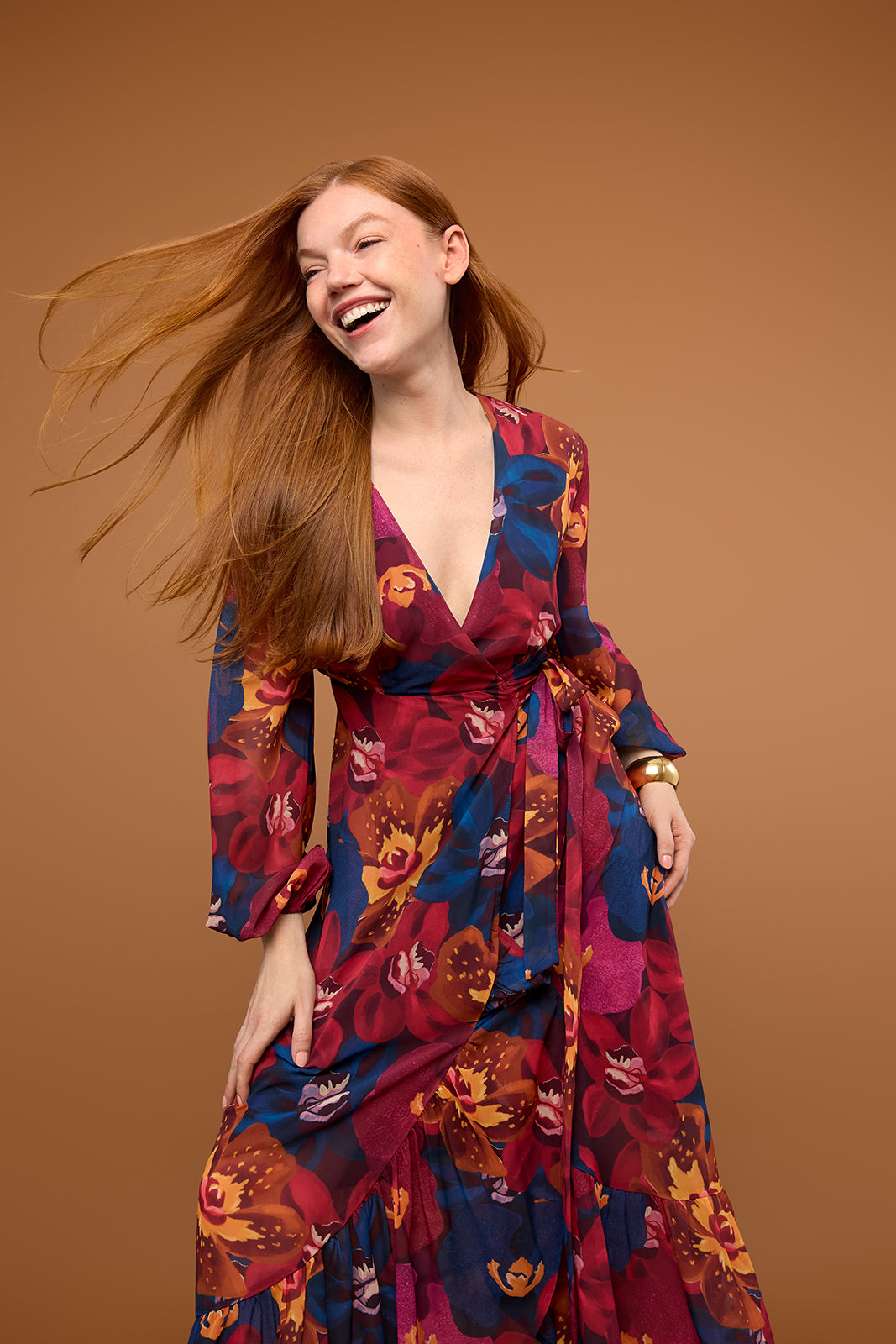 Our new maxi silhouette, designed to make a statement and simplify getting dressed for the cooler season. Its billowy sleeves, wrap design, and ruffled skirt offer ease, style and confidence whether you're heading to dinner or a fall wedding. No overthinking required. Just wrap, tie, and go.