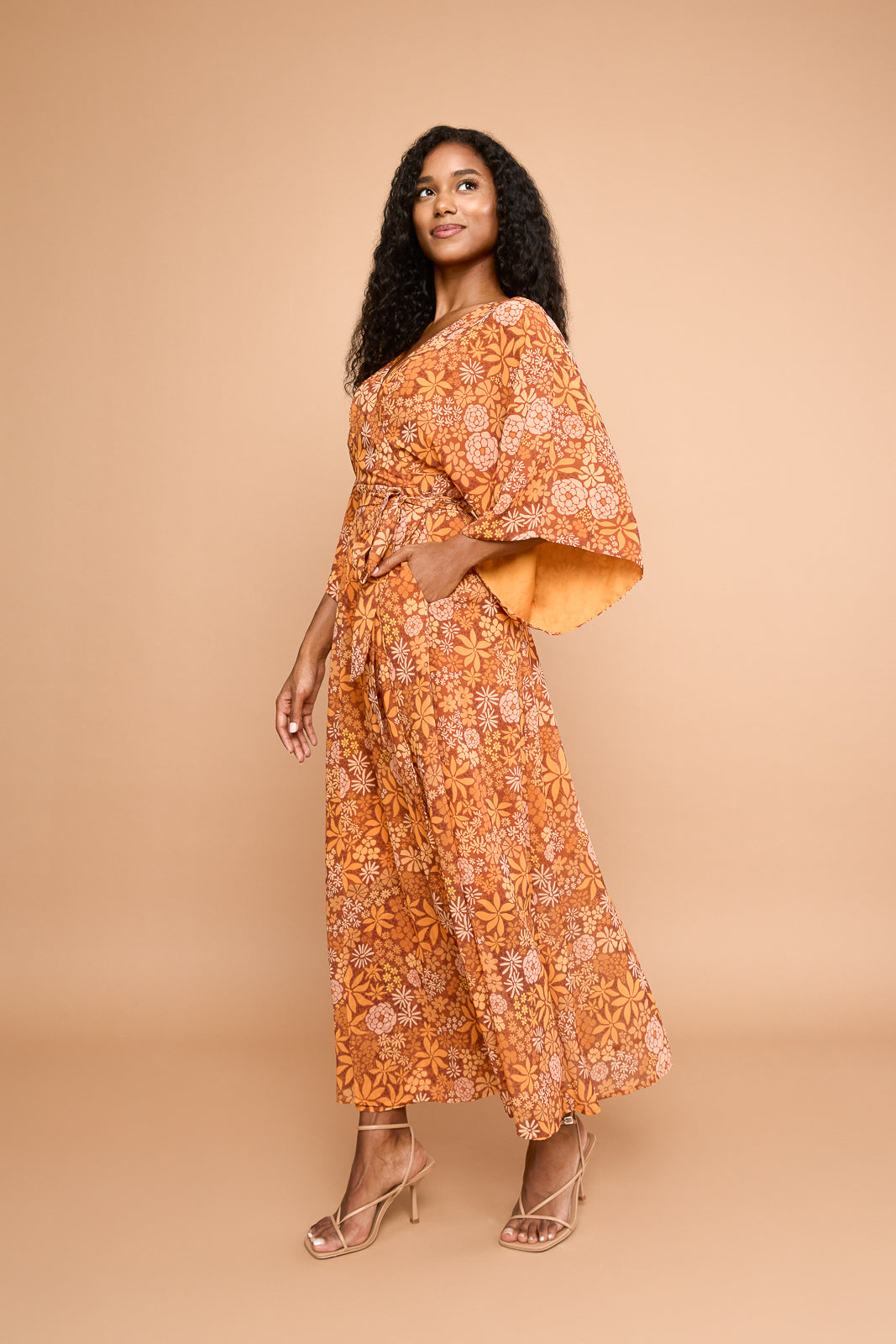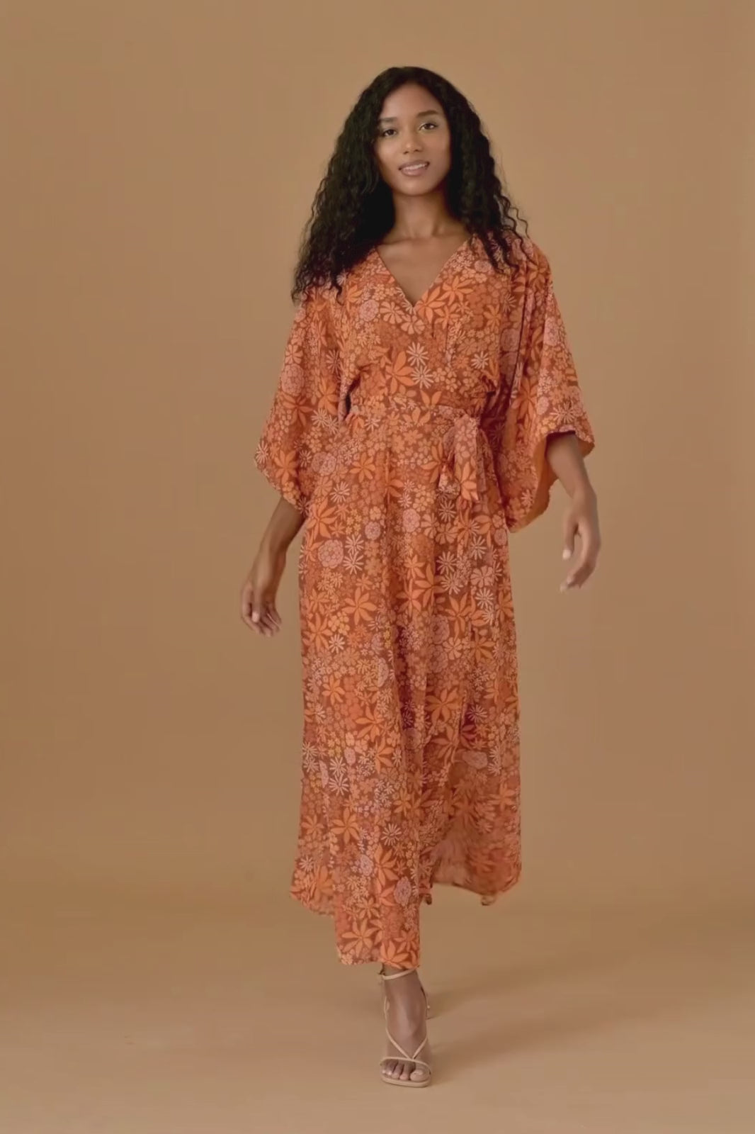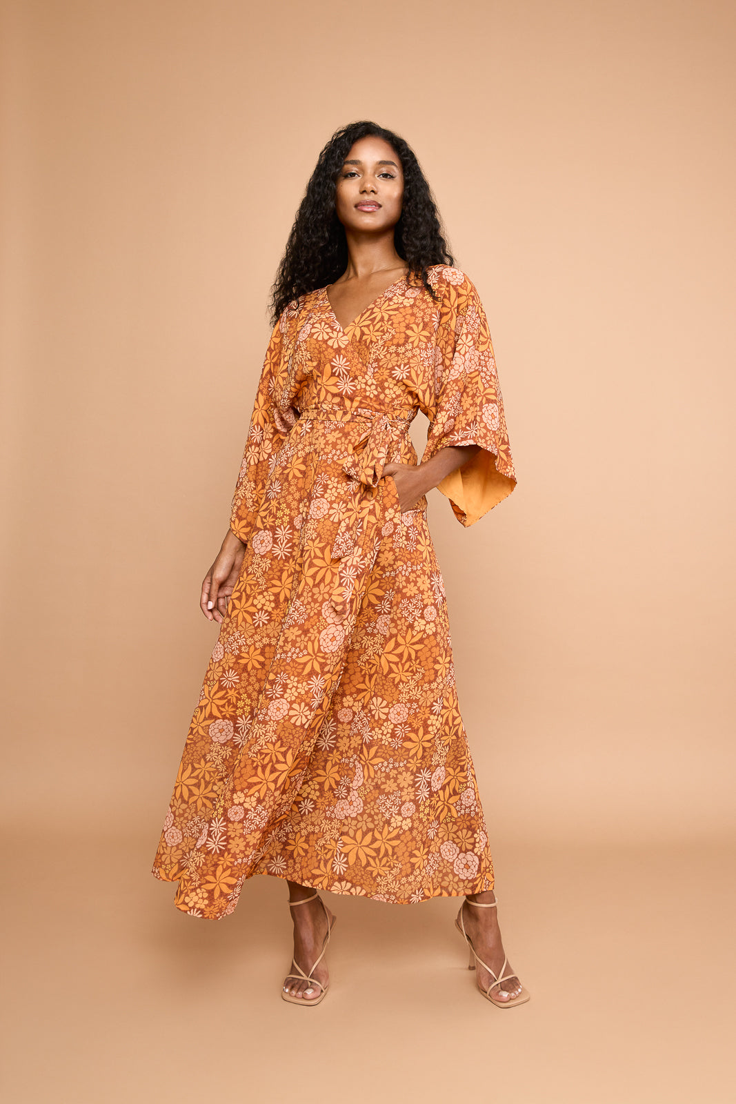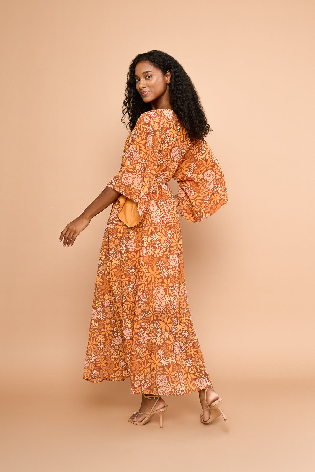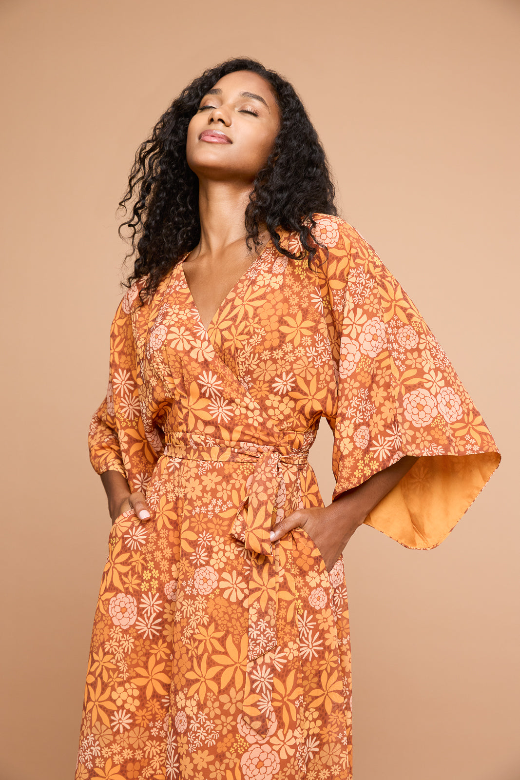For sun soaked days and golden hour evenings. The Marigold Maxi is a wrap dress designed with a v-neckline, kimono sleeves, and a lightweight, flowy skirt. An effortless, luxe, and timeless look. Style with our Marigold Silk Scarf for the full look.