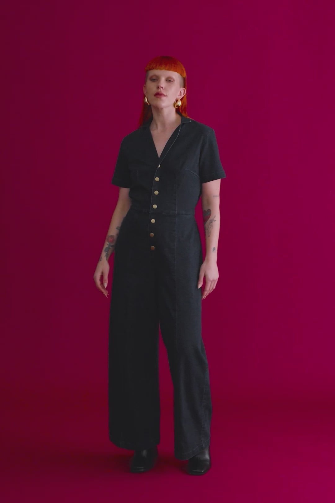 Our beloved denim jumpsuit now has a sister. Classic, sophisticated, comfortable, and several shades darker--this denim jumpsuit is our must-have closet staple. Featuring wide-legs, deep front pockets, snap button closure, and a back elastic waistline that snatches the waist and allows for a few inches of give.