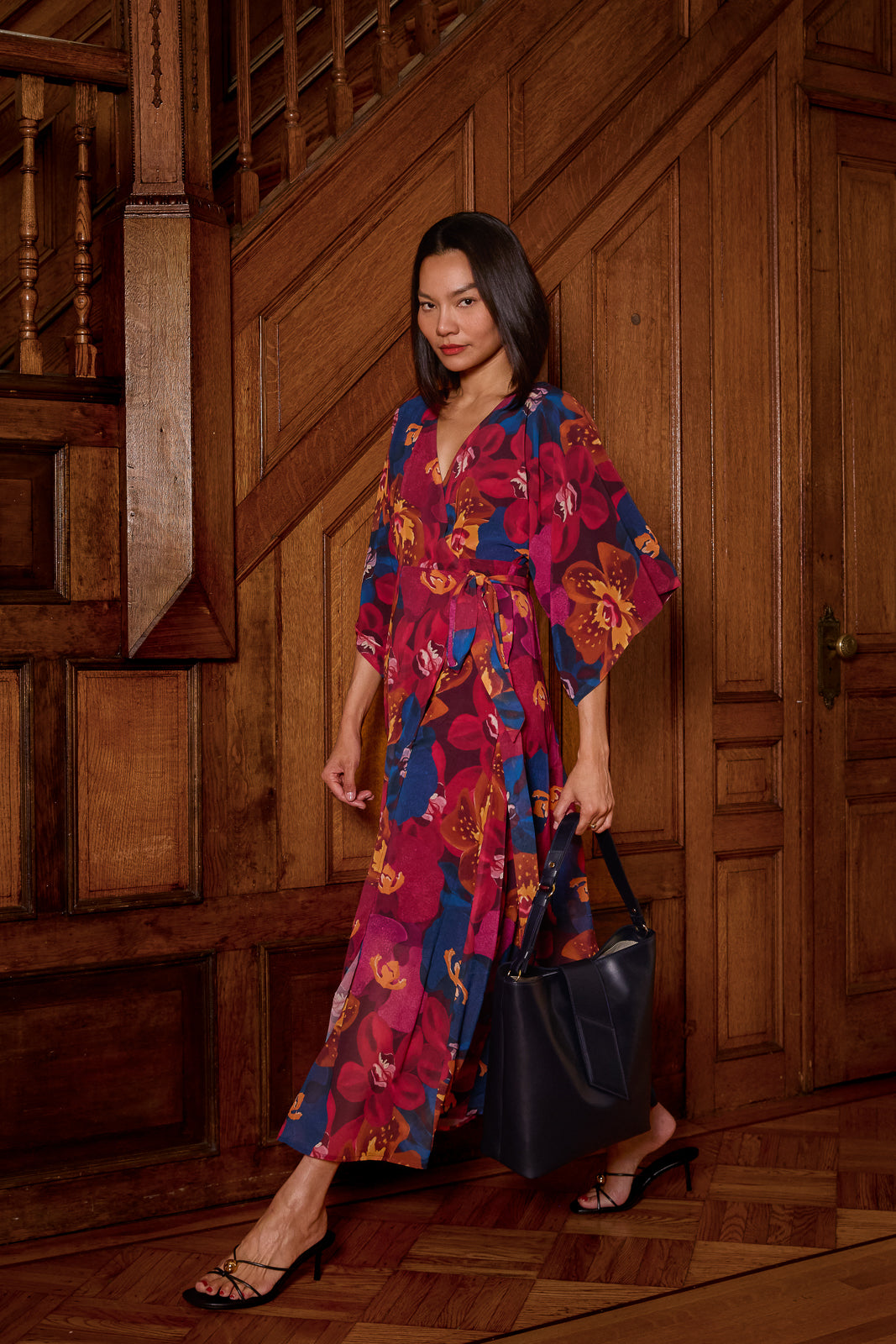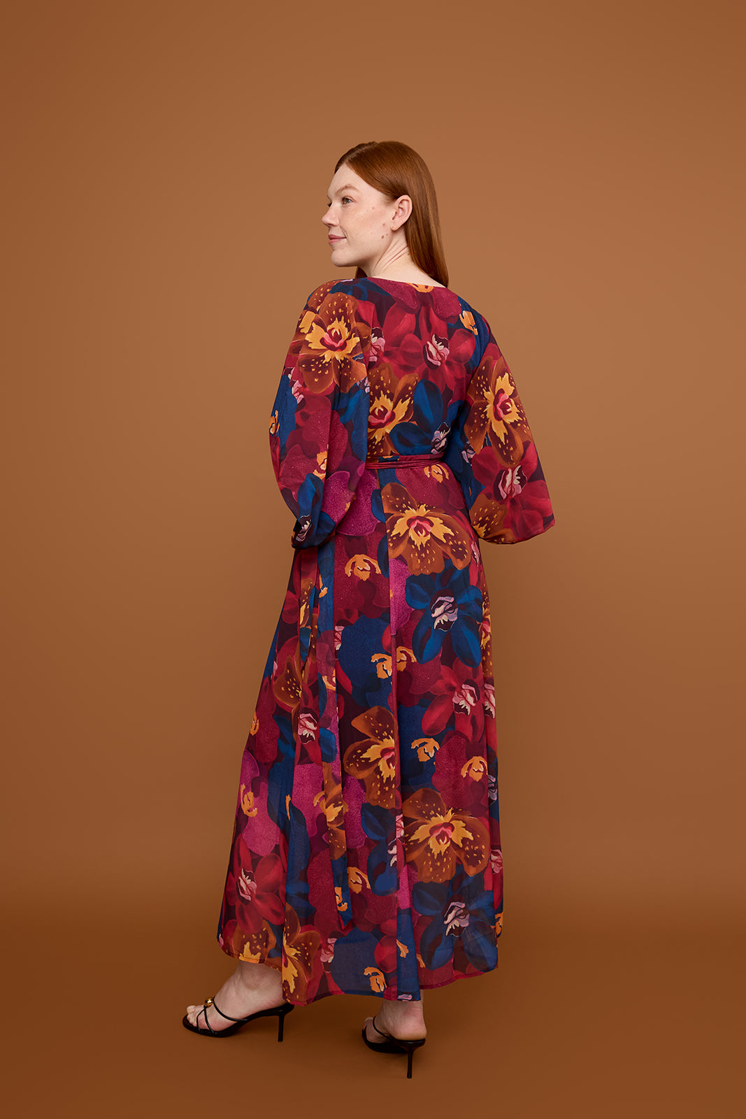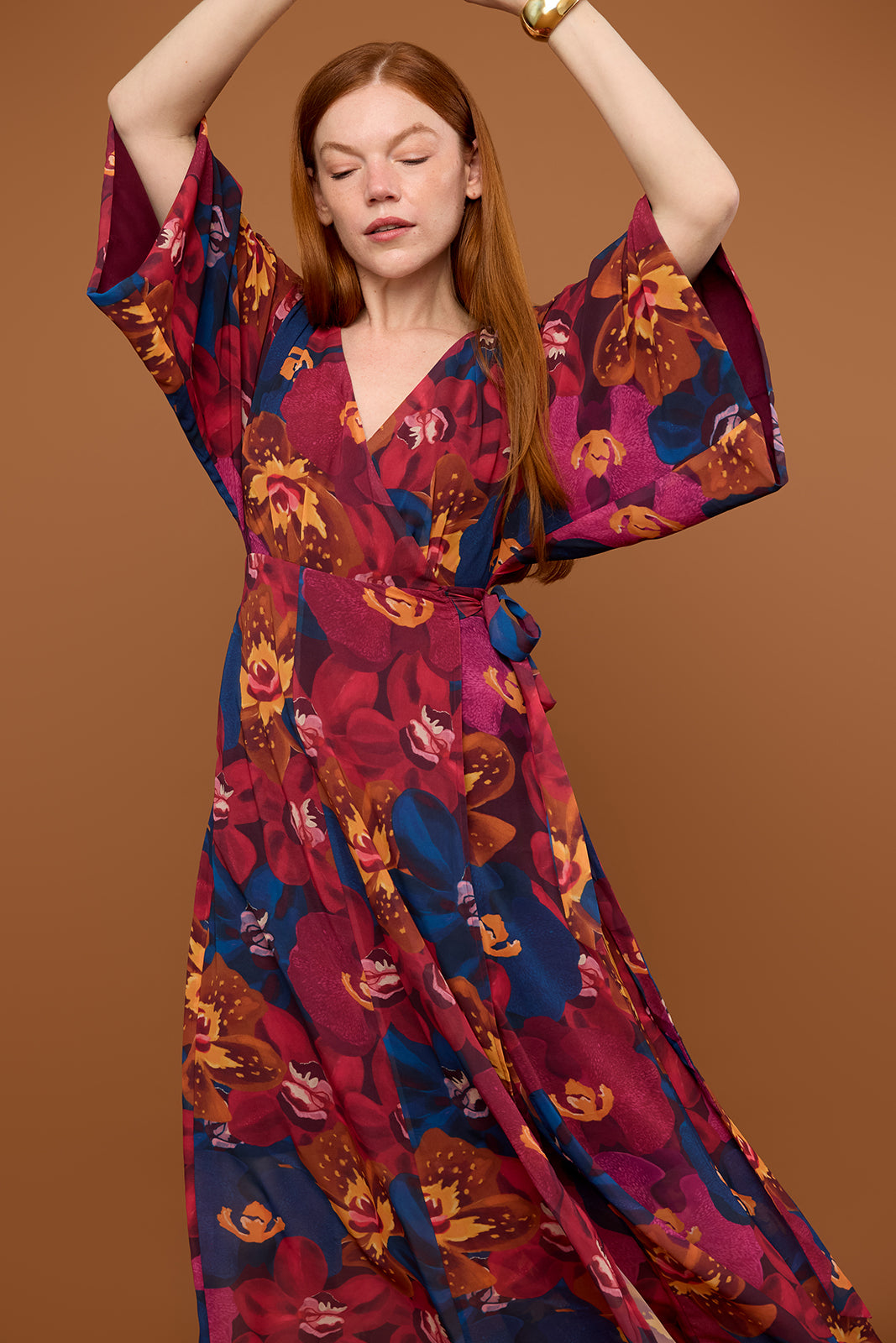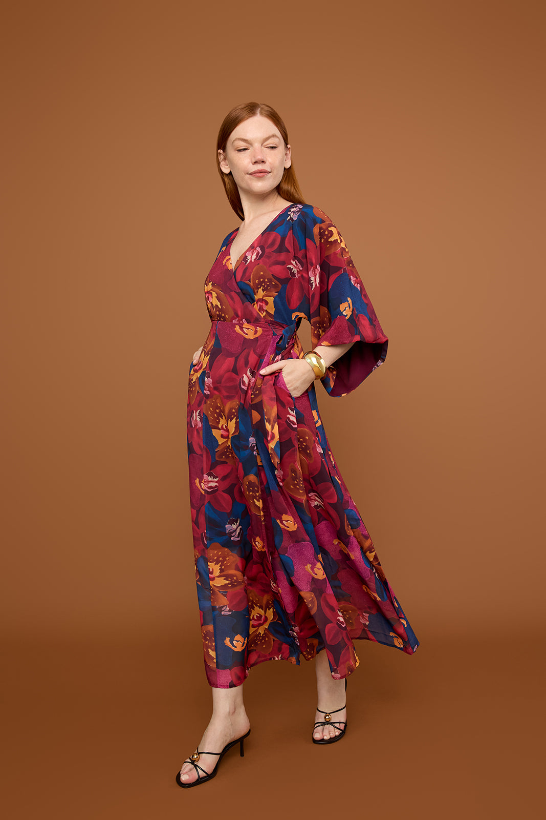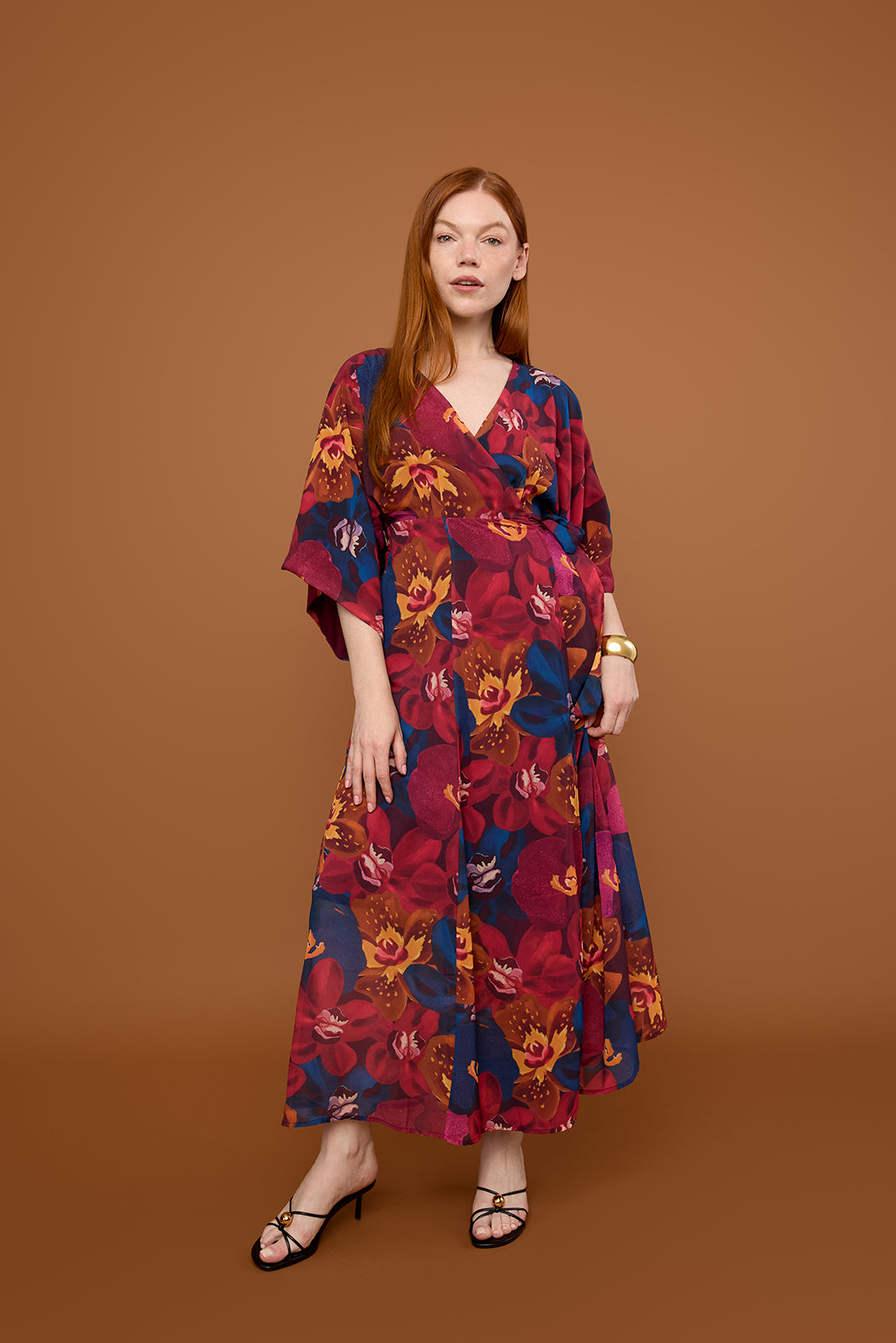 Our bestselling maxi dress silhouette covered in jewel toned orchids. The Vesper Maxi is a wrap dress designed with a v-neckline, kimono sleeves, and a lightweight, flowy skirt. An effortless statement look for your next fall occasion.